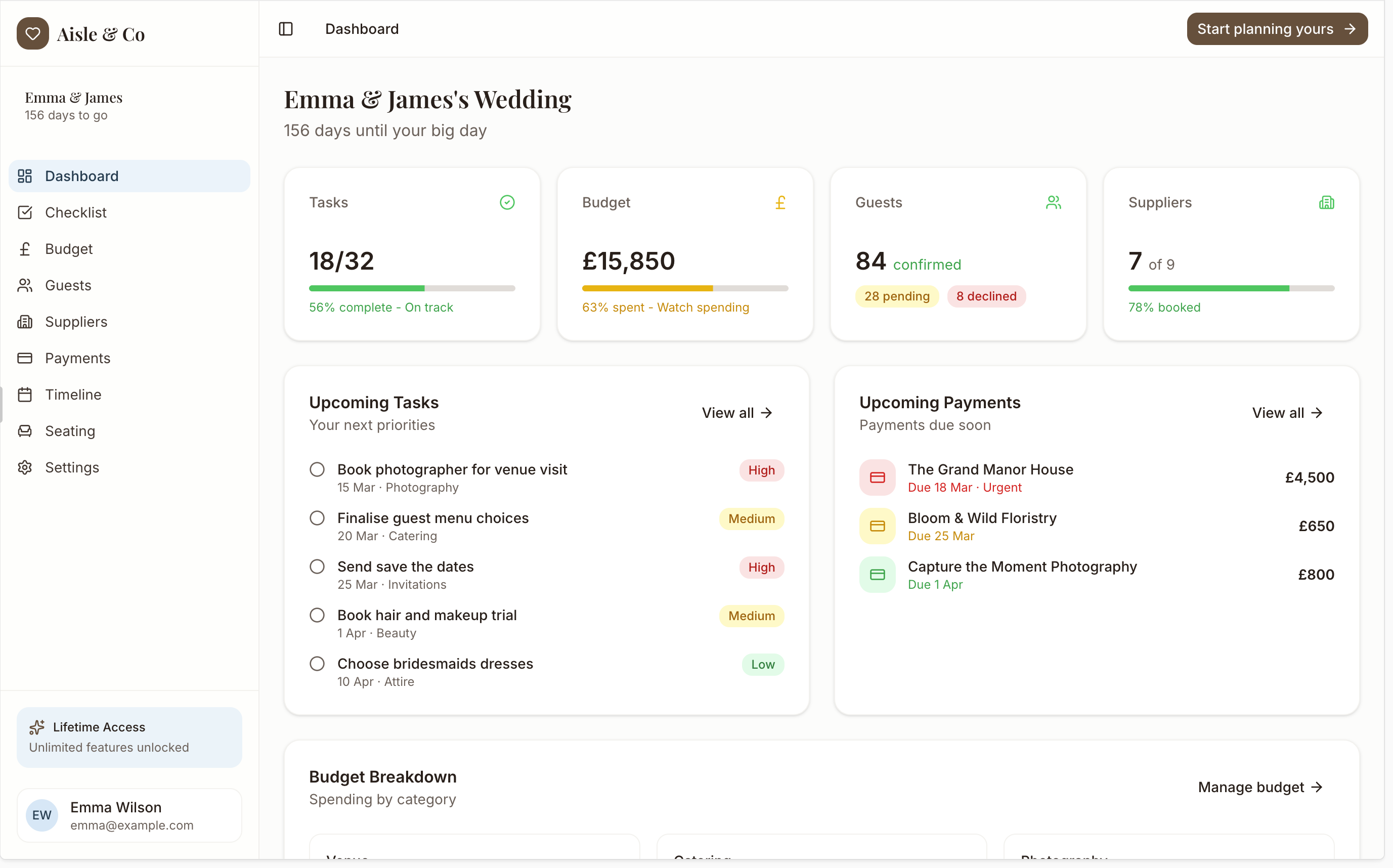 A beautifully designed dashboard that makes wedding planning feel calm and organised, not chaotic.
