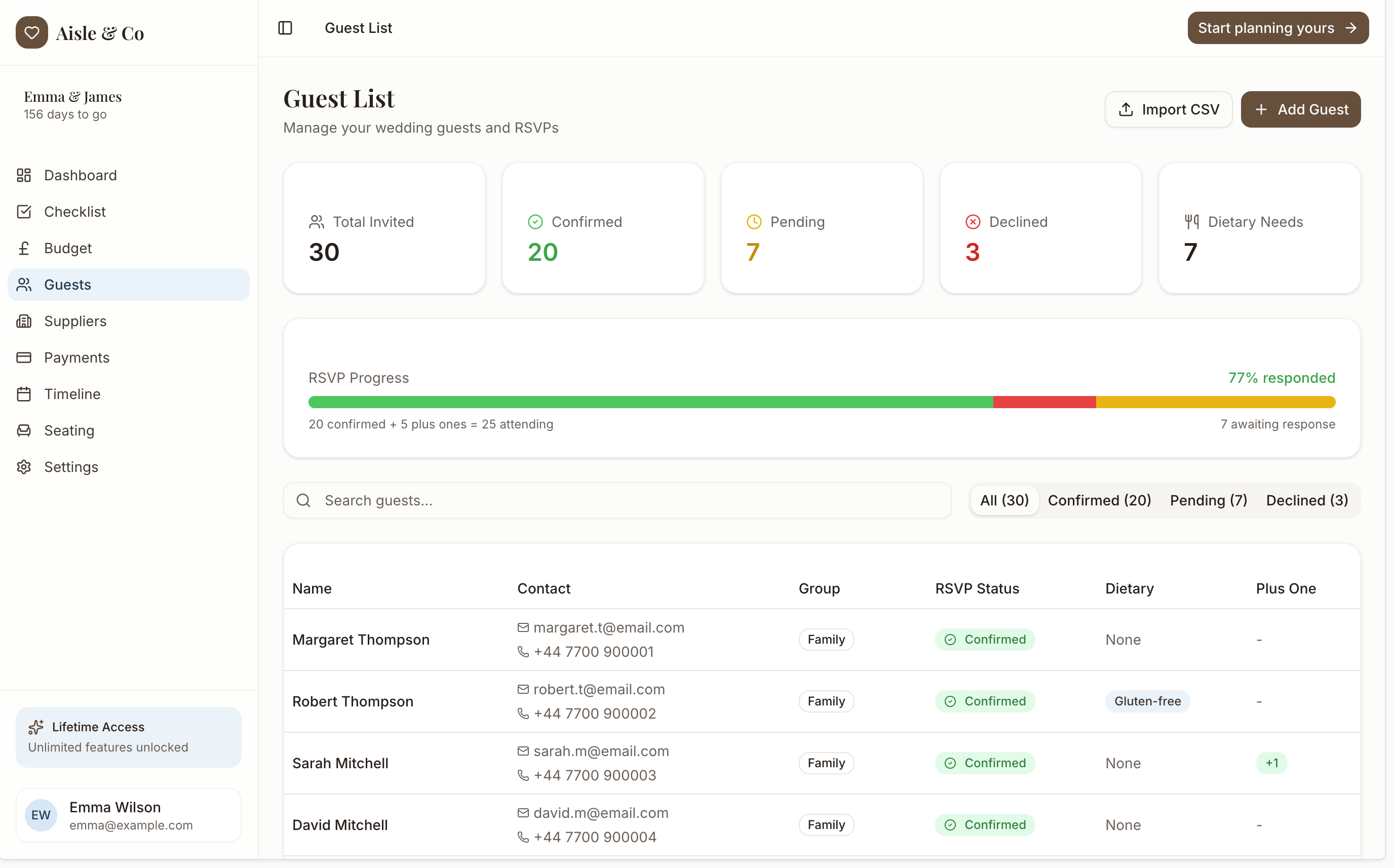 Manage RSVPs, dietary requirements, and plus ones all in one organised view.